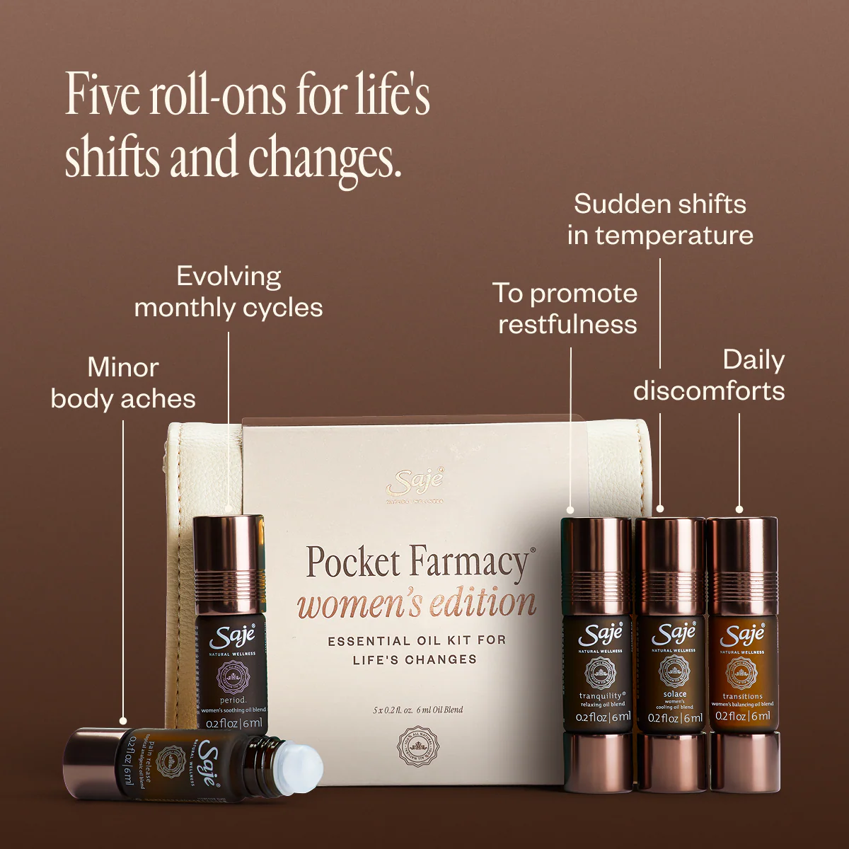 Inside, you’ll find five essential oil roll-ons to help cool you down, relieve aches, soothe you to rest and balance moods.